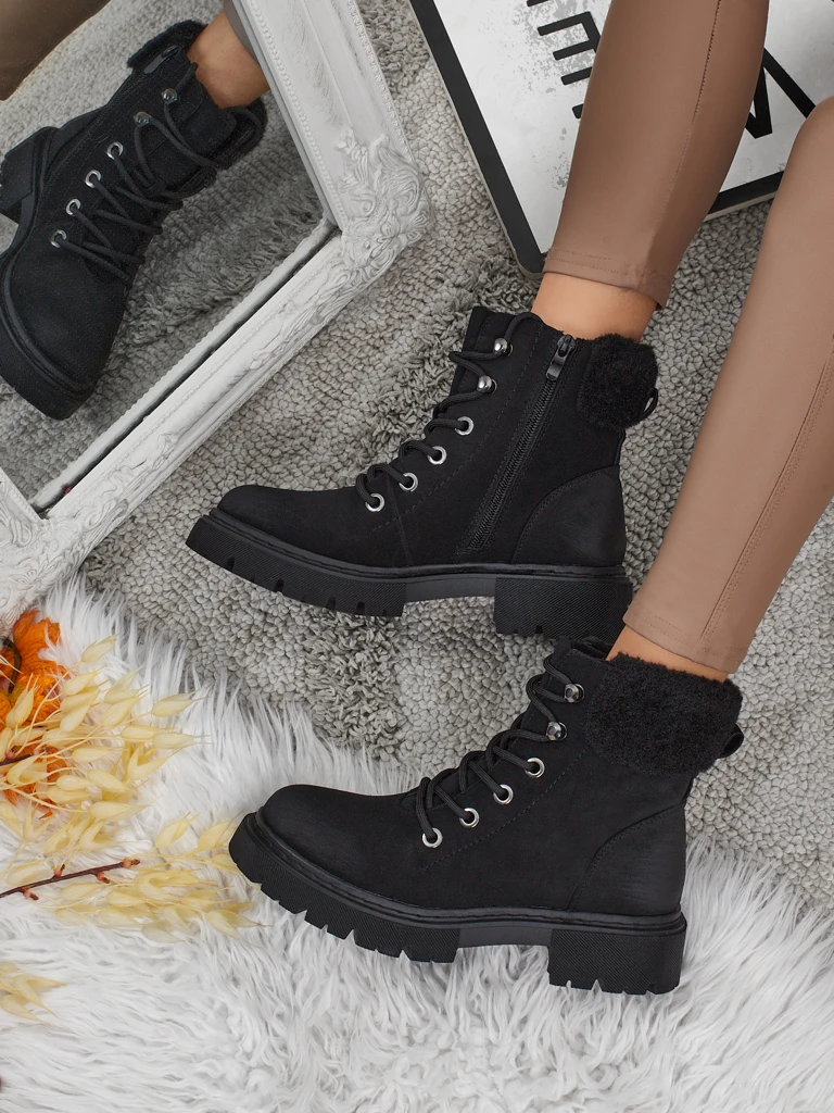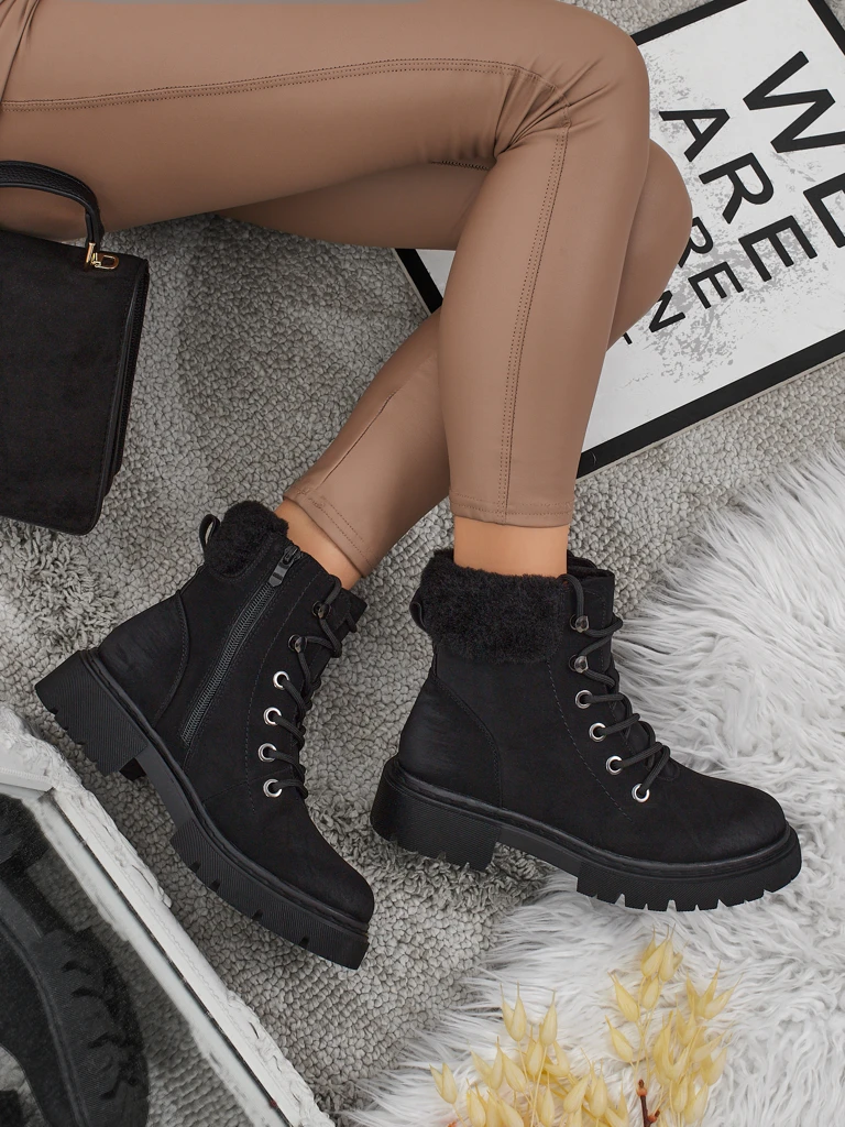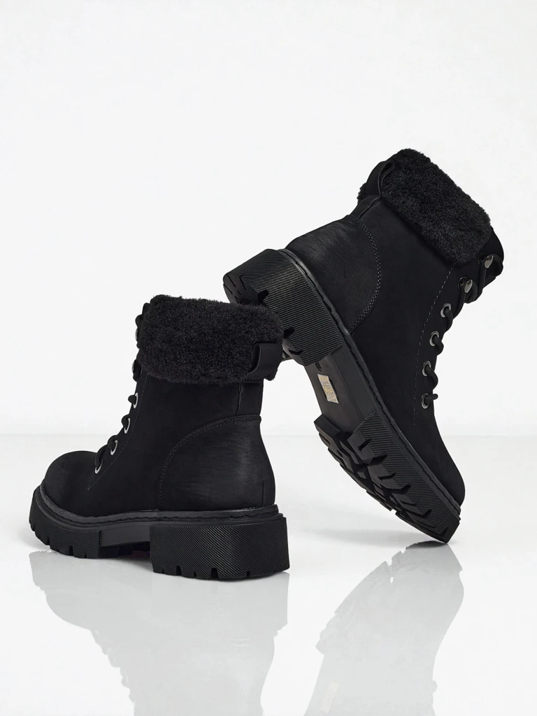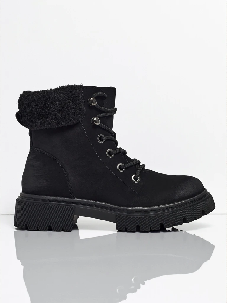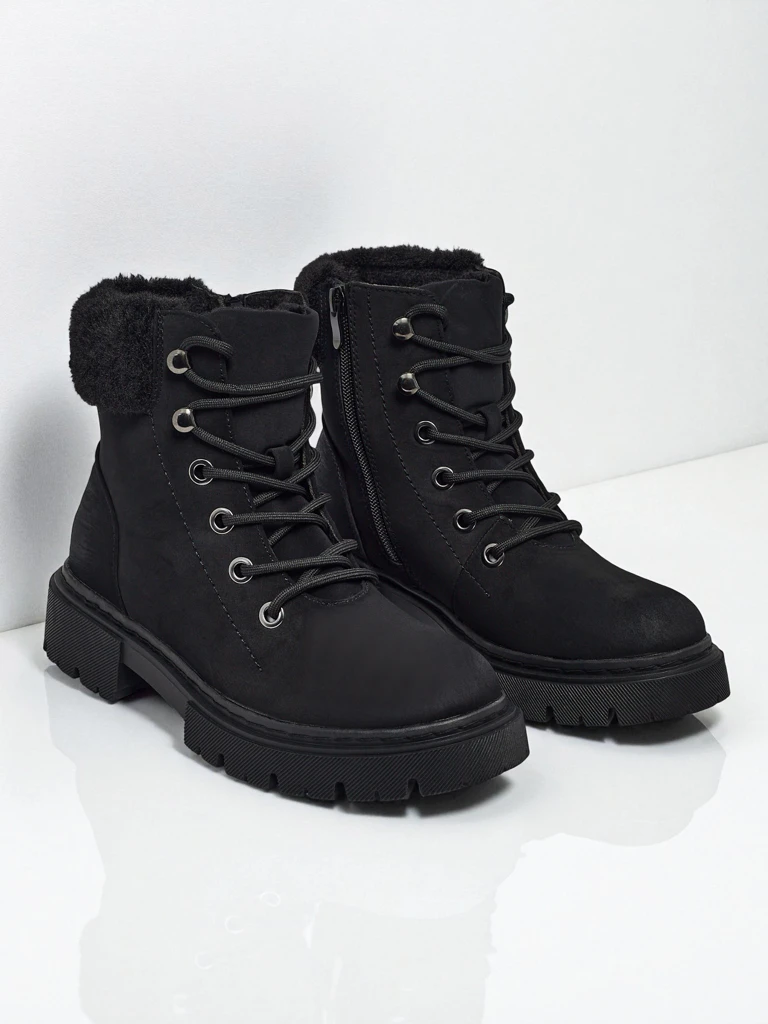 - Bottines de randonnée pour femmes avec tige lacée. Le matériau est en cuir écologique suédé. L'intérieur est isolé avec une douce fourrure. Parfaites pour l'hiver !