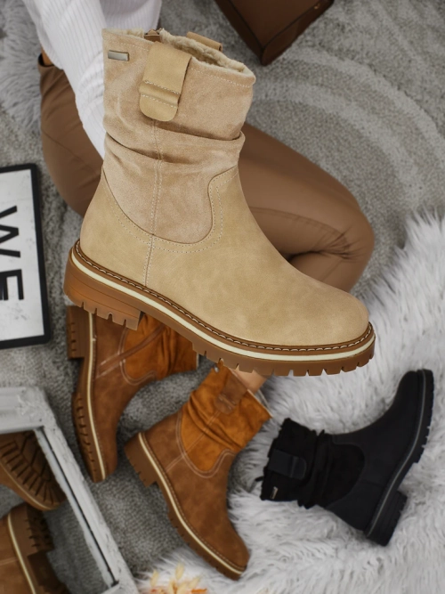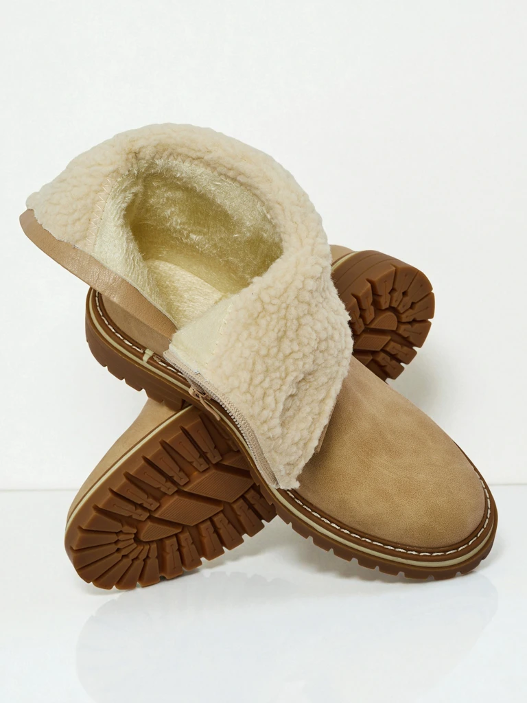 - Bottines pour femmes à fermeture éclair. Modèle en cuir écologique suédé, à semelle plate. Elles sont dotées d'une isolation de type fourrure. La tige est légèrement froncée. Confortables et élégantes, parfaites pour l'automne !