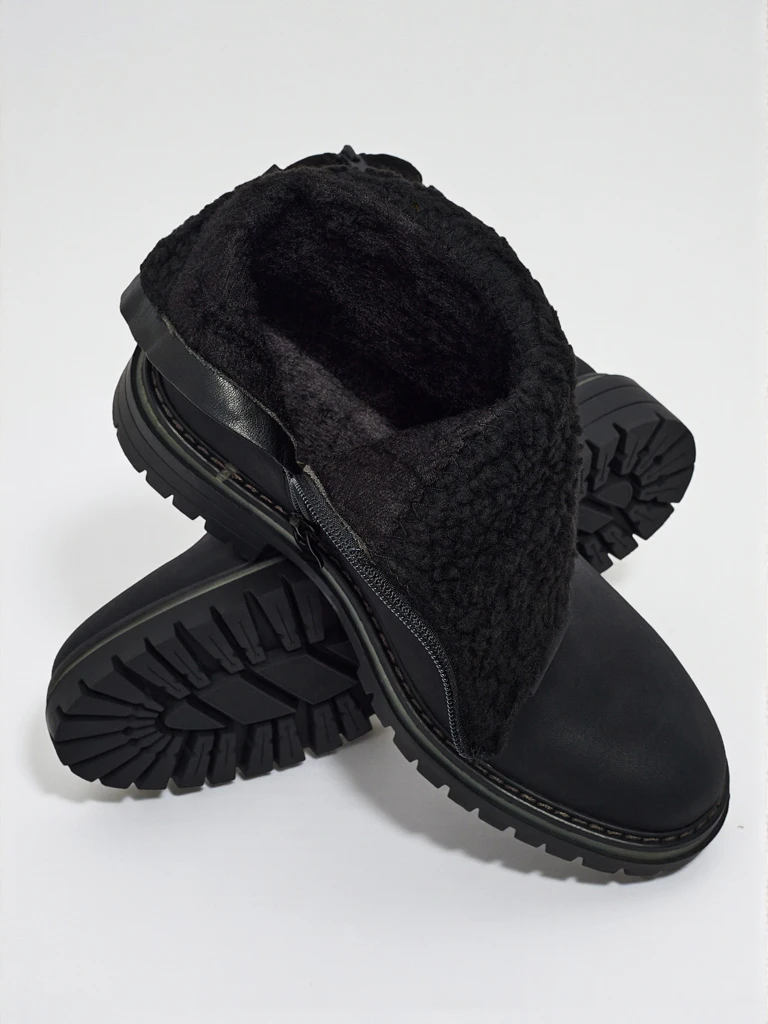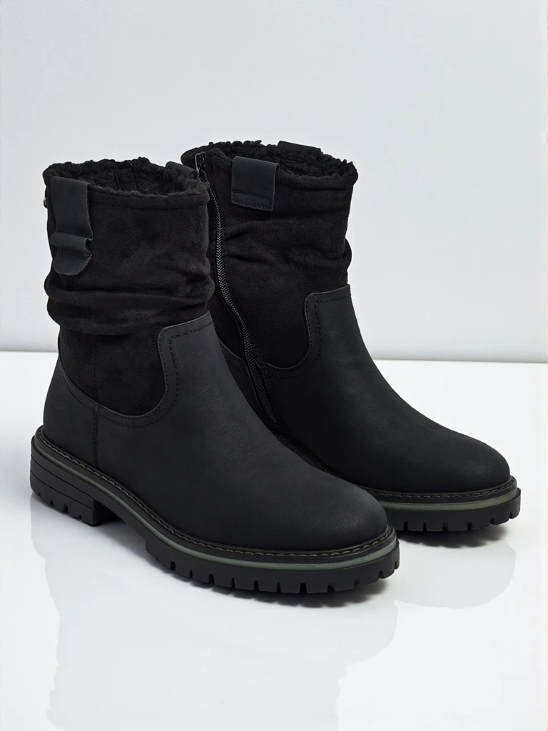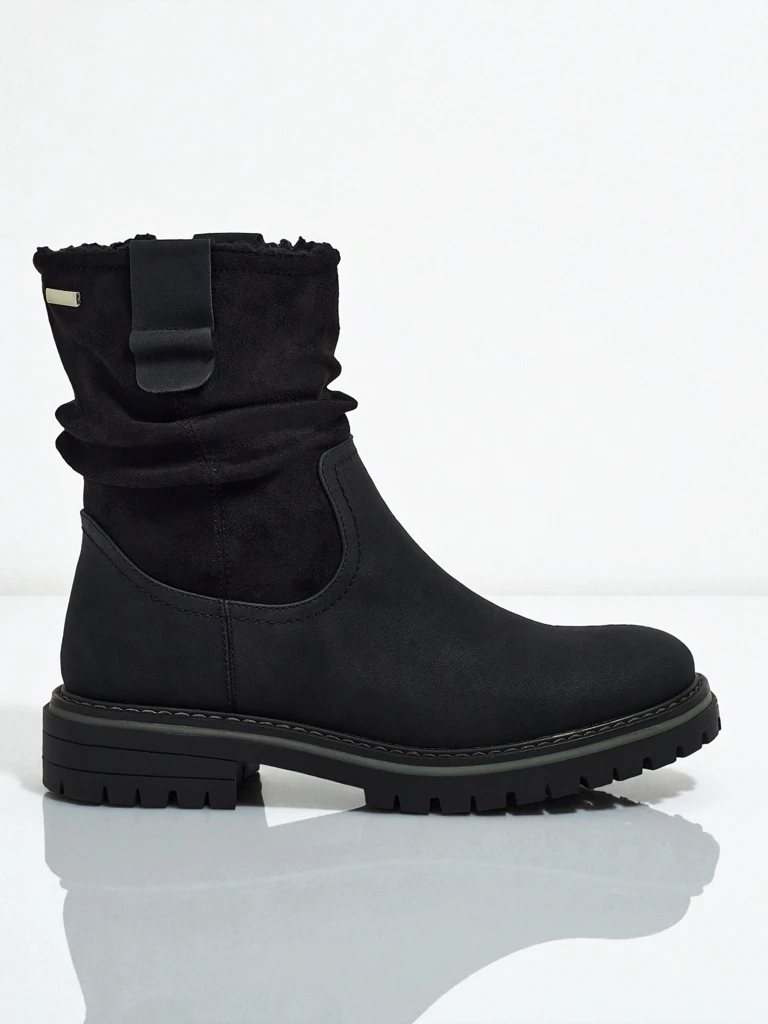 - Bottines pour femmes à fermeture éclair. Modèle en cuir écologique suédé, à semelle plate. Elles sont dotées d'une isolation de type fourrure. La tige est légèrement froncée. Confortables et élégantes, parfaites pour l'automne !