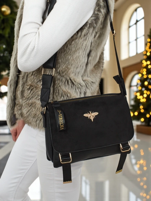 • Petit sac à main fabriqué à partir d'une combinaison de cuir écologique et de daim écologique. 3 compartiments, 4 poches, fermeture éclair et bandoulière réglable. Style et fonctionnalité dans une édition parfaite.