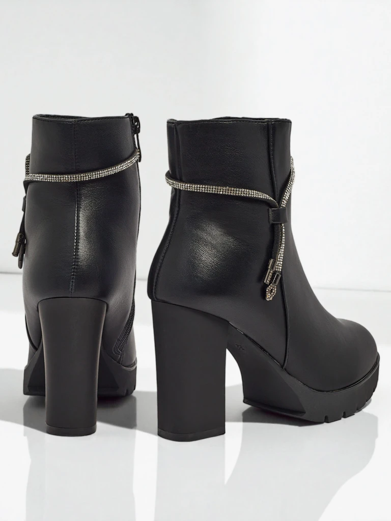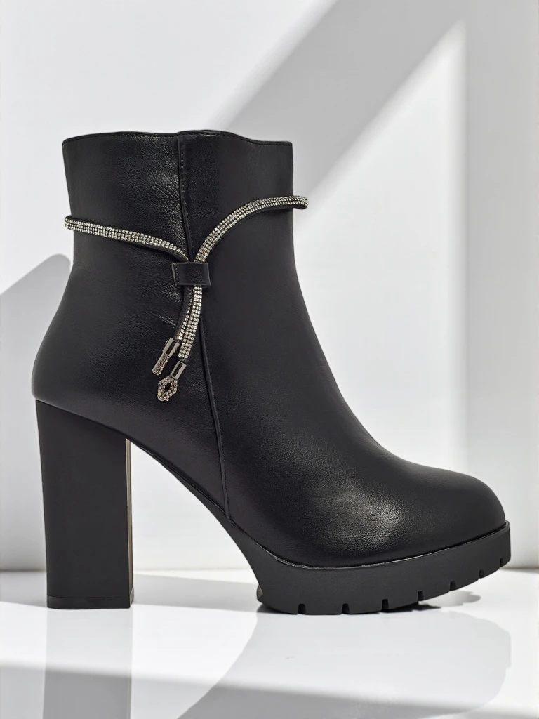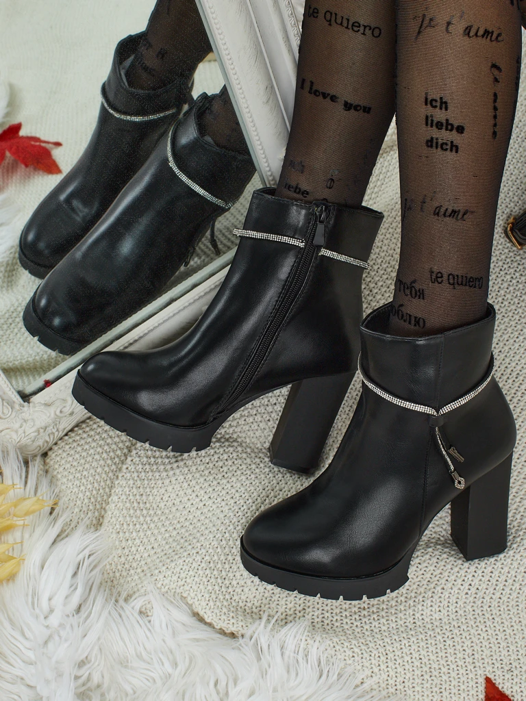 - Bottines confortables à talons épais, en cuir écologique. Modèle fermé par une fermeture éclair. Modèle légèrement isolé avec de la fourrure, possède une fermeture éclair décorative avec des zircons. Un choix idéal pour l'automne !