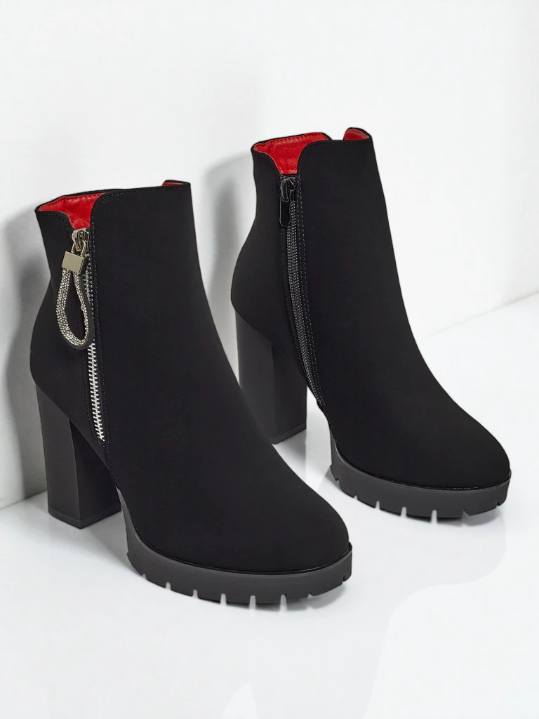 - Bottines confortables à talons épais, en cuir écologique. Modèle fermé par une fermeture éclair. Modèle légèrement isolé avec de la fourrure, possède une fermeture éclair décorative avec des zircons. Un choix idéal pour l'automne !