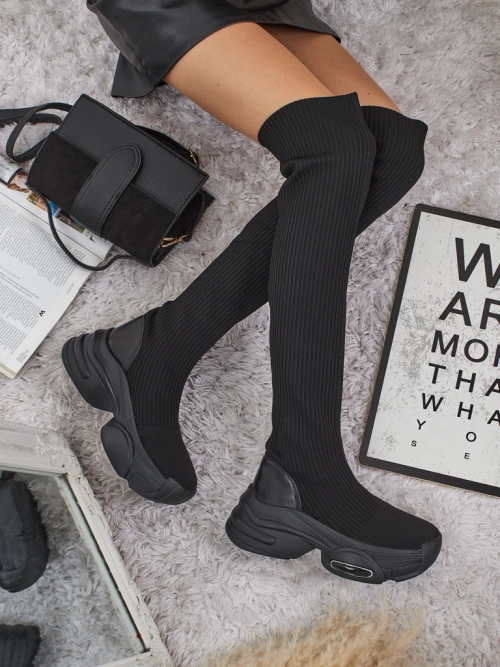- Élégantes bottes hautes pour femmes avec une semelle épaisse. La tige est faite d'un tissu élastique avec des empiècements en cuir écologique, et l'intérieur est doté d'une doublure en tissu. Modèle à enfiler. Parfaites pour les tenues d'automne de tous l