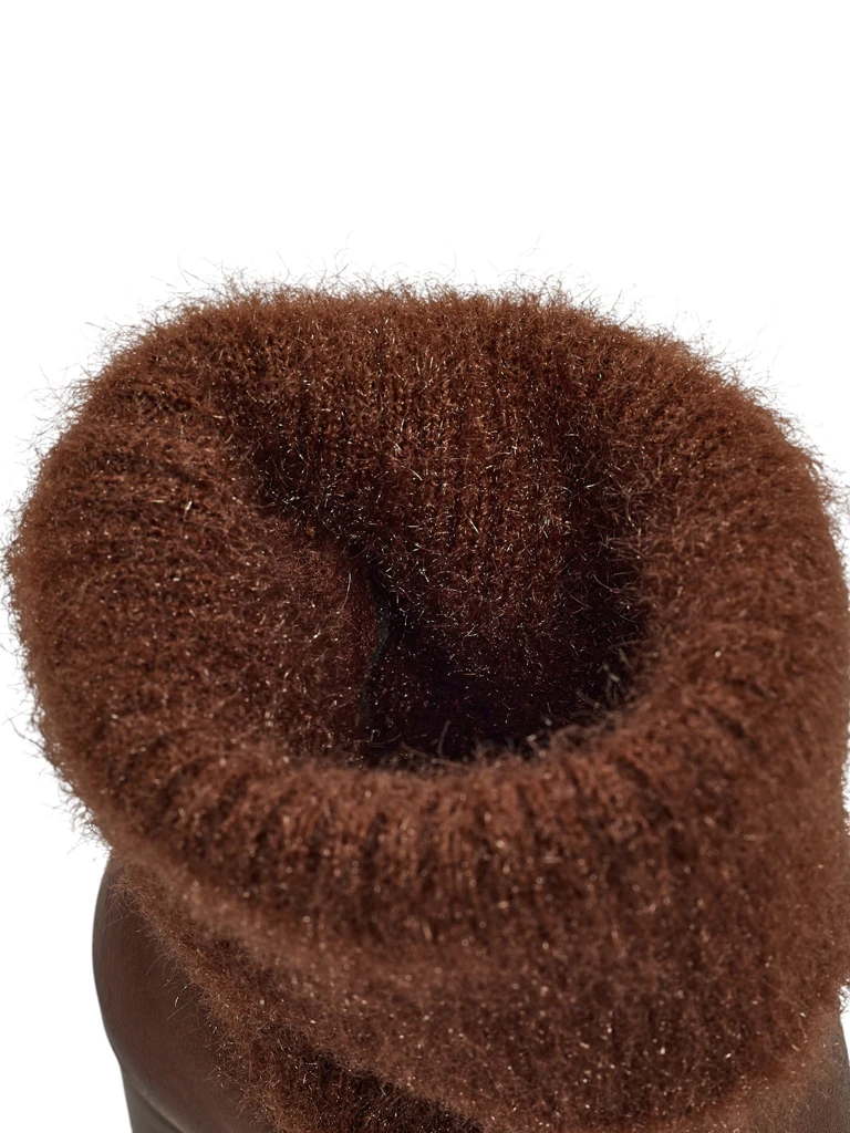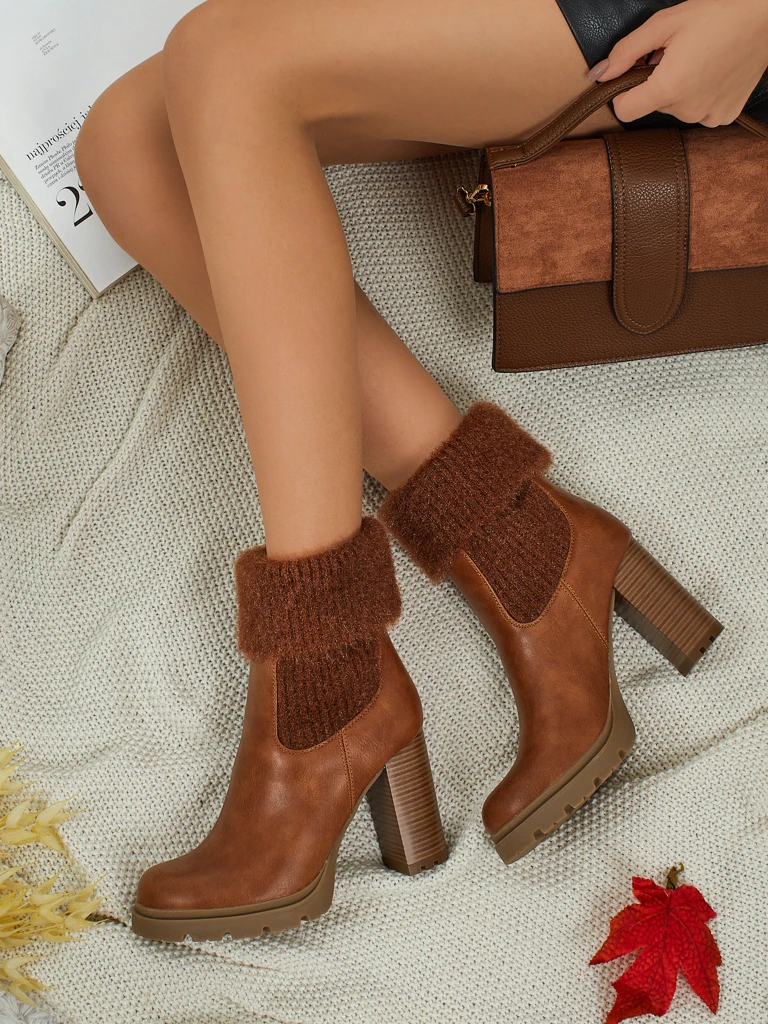 - Bottines confortables à talon bloc, fabriquées en cuir écologique avec un empiècement en tricot. Modèle à enfiler. Modèle légèrement isolé avec de la fourrure. Un choix idéal pour l'automne !