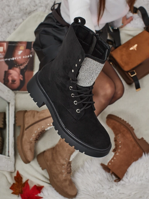 - Bottines pour femmes en cuir écologique suédé, avec fermeture éclair, lacets décoratifs et bout rond. Elles sont également dotées d'une doublure en tissu isolant, offrant modernité, confort et style en un seul produit. De plus, le devant de la tige est or