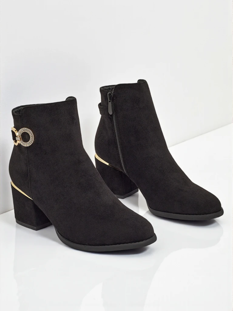 - Superbes bottines à talon bloc, fabriquées en cuir écologique suédé. Modèle fermé par une fermeture éclair. Modèle légèrement isolé avec de la fourrure, possède une décoration sur le côté de la tige. Un choix idéal pour l'automne !