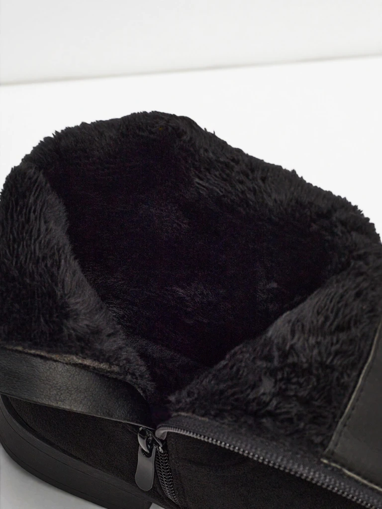 • De magnifiques bottines classiques à semelle plate, fabriquées en cuir suédé écologique. L'intérieur est isolé avec de la fourrure. Une base idéale pour les stylisations automnales !