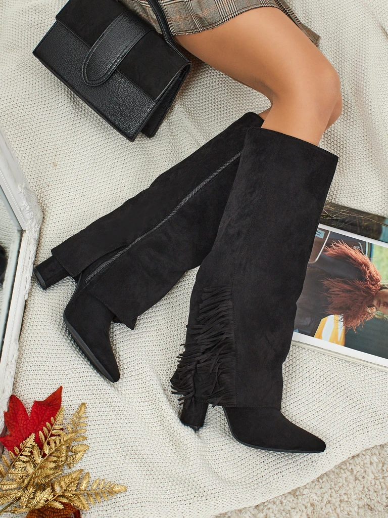 • Bottes pour femmes à talons, avec un bout pointu, en cuir écologique suédé et une tige décorative supplémentaire à franges. Les chaussures sont fermées par une fermeture éclair et isolées à l'intérieur avec de la fourrure. Elles s'accordent avec de nombre