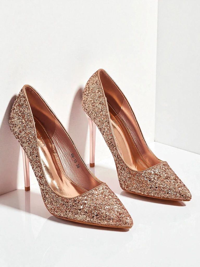 - Escarpins pour femmes en cuir écologique à talon aiguille, avec un bout pointu. Recouverts d'une couche de paillettes épaisses et brillantes, ils allient élégance et éclat subtil, parfaits pour les occasions spéciales.
