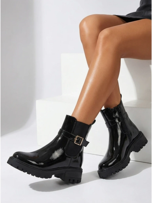 • Bottines pour femmes à fermeture éclair. Modèle en cuir écologique verni, à semelle plate. Doublure imitation fourrure. Confortables et élégantes, parfaites pour l'automne !