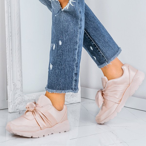 Bardzo dziewczęce sportowe obuwie, wiązane kokardką. W środku wkładka z tkaniny. Całość wykonana z tkaniny satynowej. Idealne do szkoły, pracy czy na spacer.