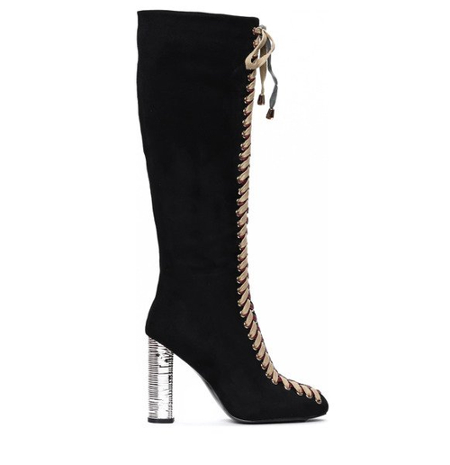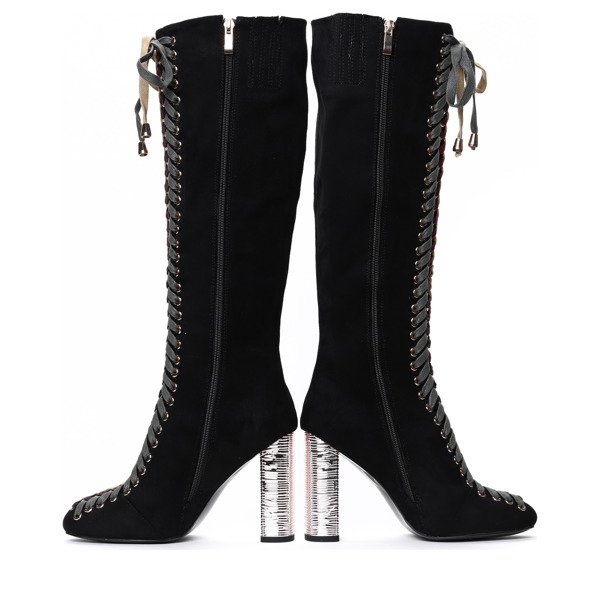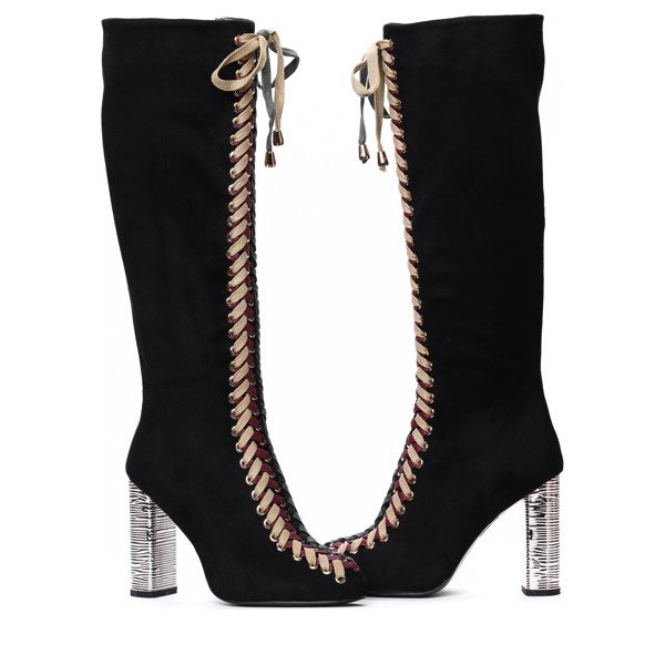 • Superbes bottes longues isolées avec de la fourrure. Tige plus rigide - a une longue fermeture éclair et une reliure décorative. Poteau de type talon décoré. Orteil haut. La tige est en daim écologique.